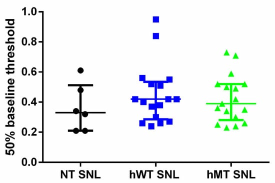 The purpose of the present original research at first consists in investigating the basal mechanical sensitivity in mice overexpressing human wild-type (hWT) or mutated TA (hMT), as compared to control, C57BL/6 mice (non-transgenic: NT). The baseline level of mechanical sensitivity did not differ in hWT and hMT mice (Figure 1; Kruskal–Wallis test = 1.478; p = 0.4777.