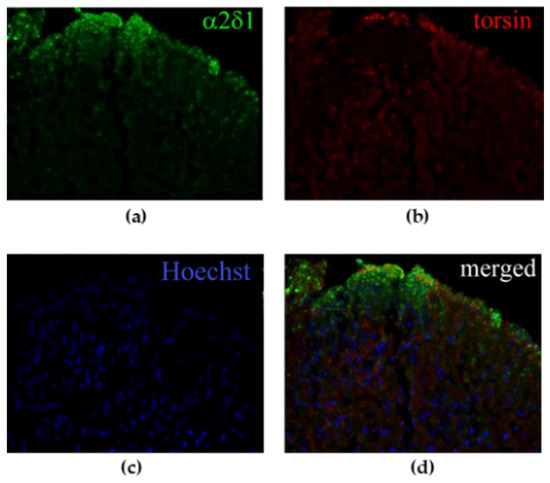 Immunoreactivity in the spinal dorsal horn of spinal nerve ligation (SNL) mice on the 7th day of (a) α2δ-1 L-type calcium channel subunit and (b) torsin A (TA). (c) Nuclei have been counterstained with Hoechst. (d) TA and α2δ-1 colocalize in the most superficial laminae of the spinal dorsal horn ipsilateral to the ligation (20× magnification).