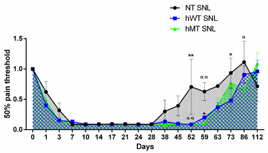 Both types of transgenic animals do not show differences in the development and maintenance of mechanical allodynia induced by SNL compared to non-transgenic animals, and in the 40 days following surgery, mechanical sensitivity is unchanged in the three different strains, as shown in (Figure 3). On the contrary, hWT and hMT mice present a delay in recovery from sensitization in comparison with NT mice, as shown by the highlighted longer-lasting mechanical allodynia (Figure 3) (two-way ANOVA F (32, 374) = 1.561; p < 0.05 *; day 52 hWT vs. NT p < 0.01 **, hMT vs. NT p < 0.01 αα; day 59 hWT vs. NT p < 0.05 *, hMT vs. NT p < 0.01 αα; day 73 hWT vs. NT p < 0.05 *; day 86 hMT vs. NT p < 0.05 α).