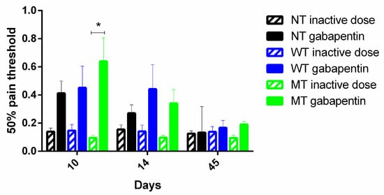 NT mice and hWT or hMT mice have been treated with an active (100 mg/Kg ip) or an inactive (1 mg/Kg ip) dose of gabapentin at the peak of mechanical allodynia (10th day after surgery), immediately after (day 14th), and during the recovery phase (45th post-operative day). Gabapentin has been shown to be effective in reducing allodynia at the peak (Friedman test = 13.67; p = 0.0005 ***; Dunn’s multiple comparisons test: day 10 NT inactive dose vs. hMT gabapentin vs. hMT inactive dose p < 0.05 *), but not after the peak and in the phase of recovery, as shown in (Figure 4).