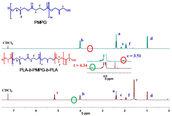 1H-NMR spectra of PMPG-1 (upper) and PLA-b-PMPG-b-PLA (TPE100, lower).