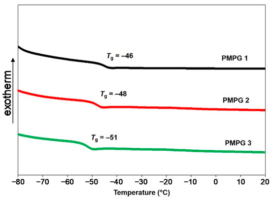 The DSC curves of the obtained PMPGs are shown in Figure 3. All the PMPGs exhibited no visible melting peak on their DSC curves. The glass transition of the obtained PMPGs were observed from −46 to −50 °C. Although the Tg values of the PMPGs tended to increase with the molecular weight, the Tg of PMPG-1 was as low as −46 °C, resulting in a very sticky transparent polymer at ambient temperature. The thermal decomposition temperatures of the PMPGs were raised by increasing their molecular weights, and the highest Td5 was observed for PMPG-1 at 377 °C.