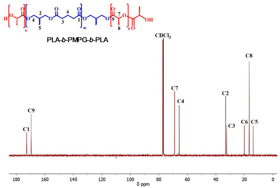 Figure 1 (lower) shows the 1H NMR spectrum of the TPE100. The signal at 3.52 (peak e, Figure 1 (upper)) for the terminal hydroxyl group of the PMPG-1 disappeared, and the new resonance at 4.34 ppm (peak t) for the hydroxyl terminal of PLA appeared in the spectrum of TPE100, indicating that the hydroxyl end of the PMPG-1 initiated the LA polymerization. Apart from the PMPG-peaks, the characteristics peaks of the PLA segment appeared at 5.2 ppm and 1.6 ppm in the spectrum of TPE100, which are the quartet peak (s) of the methine proton in the -OCH(CH3)CO- unit and the doublet peak of the methyl proton (r), respectively [32]. In Figure 4, the 125 MHz 13C-NMR spectrum of TPE100 showed the signals C7 (δ = 69.0 ppm), C8 (δ = 16.6 ppm), and C9 (δ = 169.6 ppm) for the methine, methyl, and carbonyl carbons of the PLA segment, respectively. Apart from the signal for the carbonyl carbon of PMPG, no other signals appeared in the carbonyl region of δ = 169–174 ppm which could be assigned to the mixed comonomer junctions [21]. These results are supported by the observations in the previous reports on the block copolymerization of LA from other aliphatic polyesters [9,13,33,34,35].
