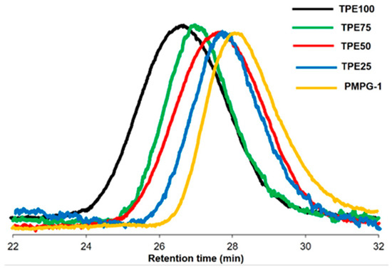 GPC traces of PLA-b-PMPG-b-PLA samples (TPE100, 75, 50, and 25) and PMPG-1.