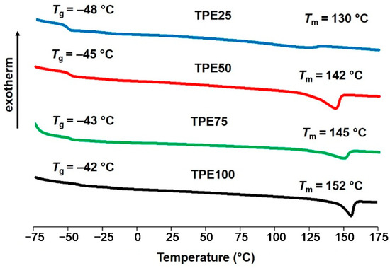 Table 3 summarizes the measured thermal properties of the TPEs. Their DSC curves (2nd heating) are shown in Figure 6. The melting points, Tm, were observed at 152, 145, 142, and 130 °C for the TPE100, 75, 50, and 25, respectively. The Tg values of the copolymers were observed in a range from −48 to −42 °C. Crystallization peaks were not observed in the heating scan of the TPEs.