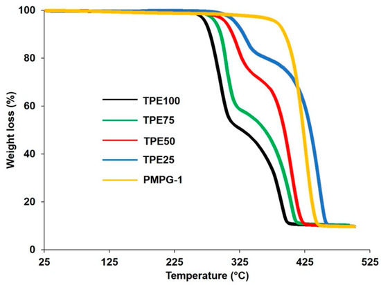 Thermal stability of the PLA-b-PMPG-b-PLAs copolymers was evaluated by thermogravimetry (TG) analysis (Figure 7). This test illustrated that the thermal degradation process of the triblock copolymers proceeded in two steps. The Td5 values of the copolymers were 257, 271, 285, and 301 °C for TPE100, 75, 50, and 25, respectively.