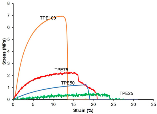 Representative stress–strain curves of the TPE100, TPE75, TPE50, and TPE25.