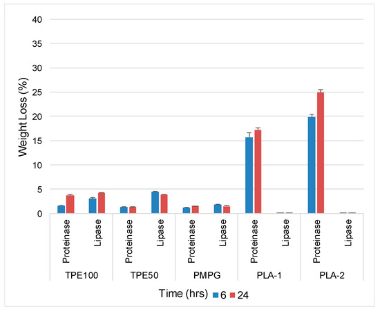 Weight loss % of TPE100, TPE50, PMPG, PLA-1, and PLA-2 in the enzymatic biodegradation using proteinase K and lipase PS.