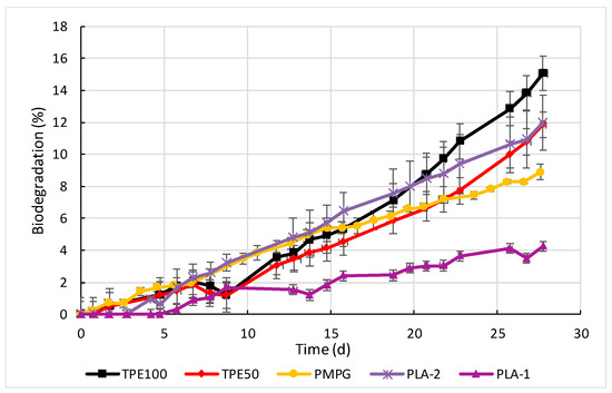 The exponential increase of global plastic production has given rise to the issue of marine pollution by plastic debris [36], which has led research works towards the improvement of biodegradability property of the plastic polymeric materials in seawater [37], so we performed the microbial biodegradation of the obtained polymers in seawater. Figure 10 represents the biodegradation (%) of TPE100, TPE50, PMPG-1, PLA-1, and PLA-2 at 27 °C for a total of 28 days in the seawater collected at Osaka port area. This biodegradation of the polymers was monitored by the amount of O2 consumed by metabolization (BOD) of the samples by the microorganisms in the seawater. Although the used seawater for PMPG was taken on a different day from that used for TPEs, the results could be roughly compared. The results of PLA-1 and PLA-2 in our previous report [29] were also included in Figure 10 for a rough comparison. For all samples, O2 consumption gradually increased with time. The observed biodegradations of TPE100, TPE50, and PMPG after 28 days were around 15%, 12%, and 9%, respectively.