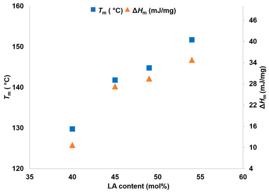 Plots of melting point (Tm; °C) and melting enthalpy (ΔHm; mJ/mg) vs. LA content of the PLA-b-PMPG-b-PLA triblock copolymers.