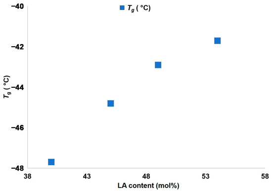 Plots of glass transition temperature (Tg; °C) vs. LA content of the PLA-b-PMPG-b-PLA triblock copolymers.