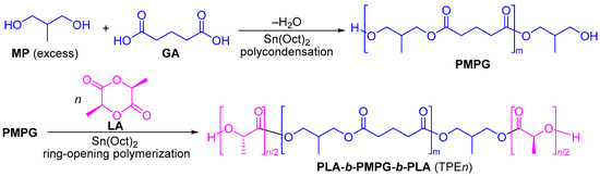 2-Methyl-1,3-propanediol (MP) (Tokyo Chemical Industry (TCI), Tokyo, Japan) and glutaric acid (GA) (TCI) were used as received. L-Lactide (LA) (TCI) was purified by sublimation in nitrogen prior to use. THF and toluene (Kanto Chemical, Tokyo, Japan) were distilled from sodium benzophenone in nitrogen before use and were stored over sodium. Tin(II) 2-ethylhexanoate (Sn(Oct)2) (Sigma Aldrich, St. Louis, MO, USA) was dried with molecular sieves (3Å) before using.