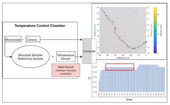 Setup of temperature control chamber: left side shows a schematic view, while the upper right image shows an example pathway of an Escherichia coli bacterium during a trial run at 25 °C. The lower right indicates the stability of the temperature for the same run over a time duration of 64 s (red box).