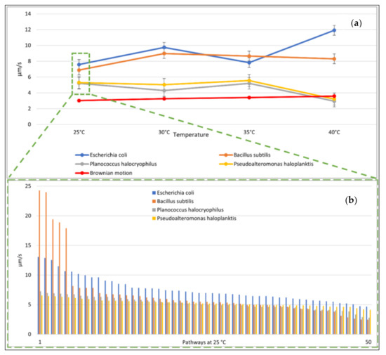 Mean microbial speed. (a) (top): Variations in mean microbial speed and particle mean speed due to Brownian motion as function of temperature with tracking accuracy. Note: The movement of the Brownian motion was simulated. (b) (bottom): Mean speed of each microbial pathway at 25 °C (sorted from fastest to slowest).