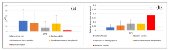 The mean relative amount of low speed (<1.4 µm/s) at 25 °C was highest for P. haloplanktis and P. halocryophilus with 8.0% and 8.1%, respectively. B. subtilis exhibited a mean relative amount of low speed of 5.8% and E. coli of 3.5% (Figure 6, mean values for the simulated pathways are also included in the figure).