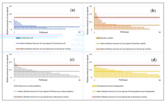 Relative amount of low speed at 25 °C with mean values (sorted from highest to lowest). (a) (top left): Relative amount of low speed of E. coli; (b) (top right): B. subtilis; (c) (bottom left): P. halocryophilus; and (d) (bottom right): P. haloplanktis. Note: The movement of Brownian motion was simulated. Its mean relative amount of low speed is shown in red. The feature low speed was here defined as speeds < 1.4 µm/s.
