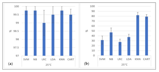 All classification algorithms were shown to have higher detection accuracy than 98% for distinguishing between observed bacteria and the simulated Brownian motion (Figure 7a). The best accuracy is that of the classification algorithm based on Support Vector Machines, Naïve Bayes, and K-Nearest Neighbor (with K = 1) (99.75% ± 0.25% classification accuracy). Six of the seven classifiers reveal the “mean distance after ten seconds” tracking parameter as the most successful classification scheme when only one parameter is used. Only the Linear Discriminant Analysis Classifier achieved a better classification accuracy with the feature mean speed.