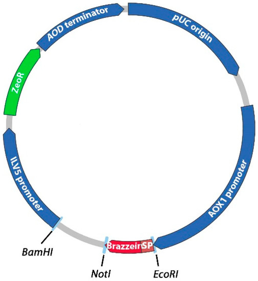 Because brazzein is difficult to obtain from its natural source, it has been expressed using various recombinant expression systems, including bacteria (Escherichia coli and Lactococcus lactis) [,,], yeasts (Saccharomyces cerevisiae, Pichia pastoris and Kluyveromyces lactis) [,,,] and transgenic plants []. The methylotrophic yeast Pichia pastoris (also called Komagataella phaffi) is known to be safe and is widely used for recombinant protein expression suitable for industrial production. This system allows high-level expression, proper folding, and posttranslational modifications such as phosphorylation and glycosylation under the control of strong and tightly regulated promoters. In addition, proteins can be secreted by the yeast P. pastoris at high levels in minimal medium, facilitating purification from the culture supernatant and reducing downstream costs. The natural secretion of proteins is also advantageous in that the protein possesses an N-terminus identical to the natural protein if the signal peptide is properly cleaved. The yeast P. pastoris has already been successfully used to express the sweet-tasting proteins thaumatin, monellin, lysozyme and the sweet-taste-suppressing protein gurmarin [,,,,,].