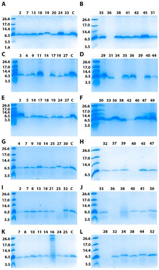 Selection of the P. pastoris clone secreting brazzein. SDS-PAGE analysis of 14 or 15 clones selected for each construct among the colonies. (A) 10-mL culture was grown for 4 days after induction with methanol before being loaded on a 16% SDS-PAGE gel. The molecular mass standards are indicated on the left in kDa. For each construct, a control (C) representing brazzein production under the same conditions as the pAF-bra construct was included as a reference. For each gel, the clone number is also indicated. (A,B) represent the clones obtained with the pAA-bra construct; (C,D) the pAE-bra construct; (E,F) the pAI-bra construct; (G,H) the pAL-bra construct; (I,J) the pAS-bra construct; (K,L) the pAV-bra construct.