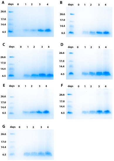 Kinetics of recombinant brazzein secretion by P. pastoris using the different constructs in the culture medium, followed by SDS-PAGE analysis. (A) shows the strain resulting from the pAF-bra construct as a reference; (B) the pAA-bra construct; (C) the pAE-bra construct; (D) the pAI-bra construct; (E) the pAL-bra construct; (F) the pAS-bra construct and (G) the pAV-bra construct. The molecular mass standards are indicated on the left in kDa.
