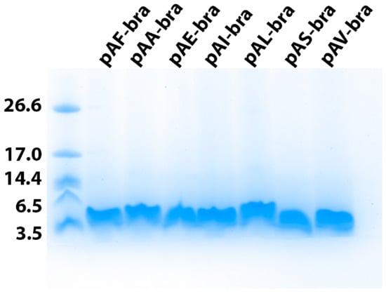 For each construct corresponding to the different signal peptides, 52 yeast transformants were isolated and tested on both MD and MM nutritive plates. The Mut+ phenotype strains grew well on the two types of plates, allowing characterization of this phenotype compared to the MutS phenotype presenting limited growth on MM plates. Indeed, the integration of the expression cassette into the AOX1 locus of the P. pastoris genome allows either a MutS phenotype corresponding to a dysfunctional AOX1 gene or a Mut+ phenotype corresponding to the functional AOX1 gene. From the 52 tested clones, we found that 36%, 36%, 32%, 32%, 52% and 46% were MutS phenotypes for the pAA-, pAE-, pAI-, pAL-, pAS-, and pAV-bra constructs, respectively. A set of 15 clones presenting the best growth on plates independent of their phenotype were picked up for 10-mL cultures for 4 days after induction. SDS-PAGE analysis of the yeast supernatants is presented in Figure 2. Interestingly, most of the tested constructs allow secretion of brazzein in the culture medium. Some differences in terms of band intensity can be observed; however, in a small volume, these variations cannot be considered significant. Additionally, for each construct, one clone expressing brazzein derived from the average of the tested clones was selected for larger production and purification, allowing us to compare the amounts of purified protein.