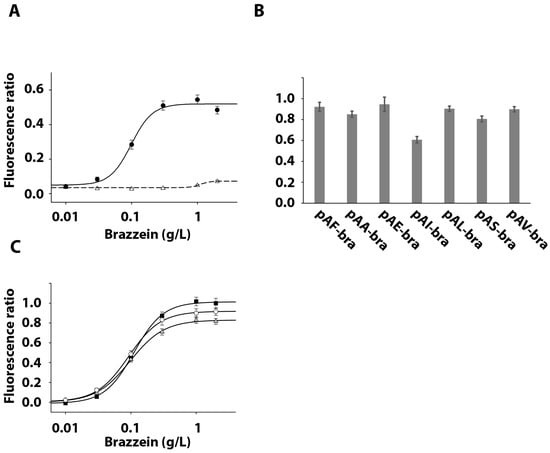 To check that the recombinant brazzein produced with the different signal peptides is sweet, we tested its ability to activate the human sweet taste receptor using a cellular-based assay. HEK293T-Gα16gust44 cells [] were transiently transfected with plasmids coding for the human sweet taste receptor subunits TAS1R2 and TAS1R3 and the GCaMP calcium sensor. Cells were then subjected to calcium imaging experiments. First, the dose-response curve was established by plotting signal amplitude versus log agonist concentration, allowing us to calculate half maximal effective concentrations (EC50) for the brazzein secreted using the Saccharomyces cerevisiae α-mating factor (Figure 5A). Then, the seven brazzein samples purified at the highest level were tested at a saturating concentration (1 mg/mL) (Figure 5B). For each construct, brazzein elicited a similar calcium signal amplitude, indicating a similar cellular response, confirming that brazzein secreted using the different signal peptides has the same capacity to activate the sweet taste receptor. Moreover, the posttranslational modifications observed on three of the secreted brazzein samples did not modify their ability to stimulate sweet-sensing cells compared to others. Additionally, the dose-response curves for the brazzein obtained with the signal peptide allowing the best expression were measured. They present similar EC50 values (0.111 +/− 0.004 g/L, 0.097 +/− 0.004 g/L, 0.092 +/− 0.003 g/L for pAF-bra, pAA-bra and pAL, respectively) suggesting similar sweetness properties (Figure 5C).