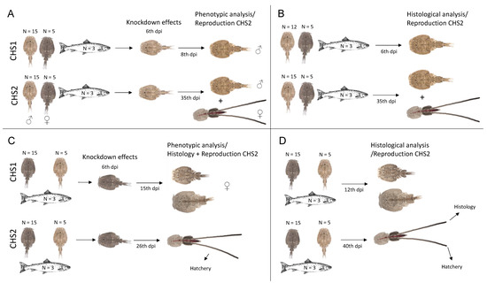 Illustration of the study setup. Trial 1 (A) and trial 2 (B) are males subjected to RNAi knockdown. Trial 3 (C) and trial 4 (D) are females subjected to RNAi knockdown. Knockdown of LsCHS1 (above) and LsCHS2 (below) for each trial. (A,C) The first arrows indicate when the knockdown analyses were performed and the second demonstrate the total number of days the lice stayed on the fish before termination. (A,B) Female with egg strings, reproduction success was studied in females placed with LsCHS2 knockdown males. (C,D) Female with egg strings, reproductive success was analyzed in LsCHS2 knockdown females. LsCHS1 and LsCHS2 knockdown lice were terminated as pre-adult II or unmatured adults and mature adults, respectively. Days post-injection = dpi.