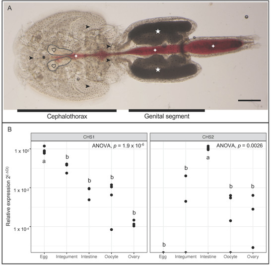 The transcriptional levels of LsCHS1 and LsCHS2 in tissues and organs in adult females. (A) Gross morphology of adult female L. salmonis. From the cephalothorax (ct), the ovaries (gray lines, hearts) and the integument (arrowheads) were extracted. The oocytes (stars) were extracted from the genital segment (gs). The blood-filled intestine (diamonds) extending from ct to gs was extracted. (B) The transcriptional levels of LsCHS1 and LsCHS2 were measured in dissected tissues and organs besides eggs using qPCR analysis (n = 3 biological replicates for the ovaries, and n = 4 for remaining tissues). The qPCR results were normalized to the reference genes (eEF1α, ADT3, and 18S). The relative expression levels are log-transformed, and letters indicate significant differences (p < 0.01, one-way ANOVA, Tukey’s test). The scale bar is 1 mm. 1 × 10−2.