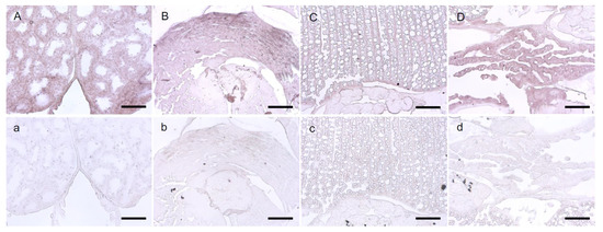 In situ hybridization of LsCHS2 in sections of adult females. Positive stainings were detected in ovaries (A), muscles (B), intestine (C), and oocytes (D) using LsCHS2-specific anti-sense probes. Sense probes (a–d) show no unspecific staining. The scale bars are 100 μm.