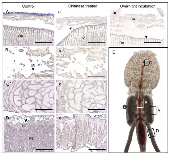 We detected chitin in the cuticle, eyes, ovaries, oviduct, oocytes, papilla, mouth tube, epithelial cells in the gut, and the fertilized egg string of L. salmonis. Chitin components have also been reported in these tissues and organs in pancrustaceans [48,49,50,51].