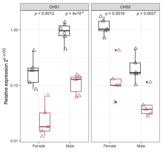 Relative expression of LsCHS1 and LsCHS2 in individual pre-adult II L. salmonis injected with dsLsCHS1 and dsLsCHS2 (CHS1 left and CHS2 right, brown), respectively, with comparable dsCPY controls (black). The qPCR results were normalized to the reference genes (eEF1α, ADT3, and 18S). One individual louse in the LsCHS2 male group shows low knockdown effects. Each triangle represents an individual sample, and outliers are marked with a circle, (p < 0.01, t-test). The relative expression levels are log-transformed.
