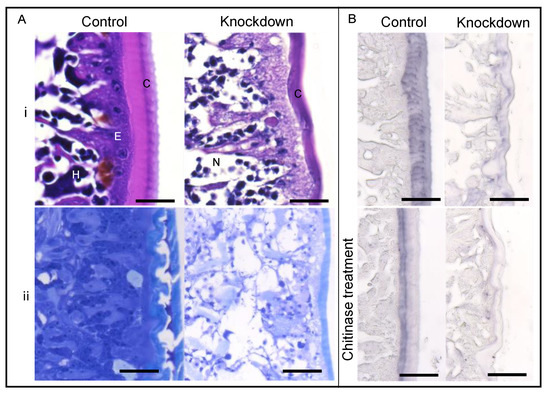 Histological analysis of sections revealed that the morphology of the cuticle in females injected with dsLsCHS1 differed from control animals. Lice with phenotype 1 and 2 had two exoskeletons present in the integument. For phenotype 2, this was typically around the genital segment only, whereas in lice with phenotype 1, this could be observed both in the cephalothorax and in the genital segment. Whereas control L. salmonis had a single cuticle with two to three distinguishable layers, LsCHS1 knockdown female lice had produced a thinner cuticle with no observable layers (Figure 7Ai,ii). The epithelial cell morphology in the LsCHS1 knockdown females differed from the control lice and appeared damaged (Figure 7Ai,ii), with the cuticle detaching from the epidermis layer (Figure 7Ai). The subcuticular tissues were necrotic (Figure 7Ai,ii). The WGA staining indicated a reduced amount of chitin in the cuticle of dsLsCHS1 compared to the control dsCPY-injected lice (Figure 7Bi). Before WGA staining, the LsCHS1 and LsCPY knockdown female louse sections were digested with chitinases to analyze if the WGA signals in the cuticle of the LsCHS1 knockdown females were reduced faster than the cuticle of LsCPY knockdown females. The chitinase treatment only reduced the WGA signals in the cuticle of the control lice, while all WGA signals were absent in the cuticle of dsLsCHS1 lice (Figure 7Bii).