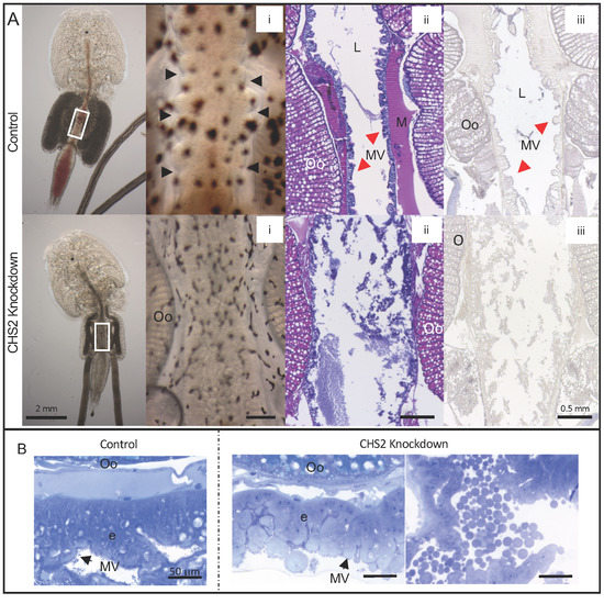 Morphology of the intestine comparing LsCHS2 knockdown and control Lepeophtheirus salmonis females. Representative photos of female lice injected with either dsCPY (control) or dsLsCHS2. (A) The midgut of control lice (upper) and experimental lice (below). The white squares (first photo) illustrate where the other images are taken (i–iii). The intestine of the control and experimental lice (i); arrowheads indicate the contraction in the control intestine (i). H&E-stained paraffin-embedded sections (ii), and WGA-labeled sections (iii) of the midgut. The microvilli are damaged with reduced WGA signals in the intestine of the dsLsCHS2-injected female louse compared to the intestine of the controls. (B) Histopathological analysis of toluidine-stained sections of control and experimental female lice. LsCHS2 knockdown louse epithelial cells and damaged microvilli (right image), particles were observed in the LsCHS2 knockdown louse (left image). The lumen of the intestine (L), muscle (M), and microvilli (MV). (A) The scale bars are 0.5 mm (i–iii). (B) The scale bars are 50 μm.