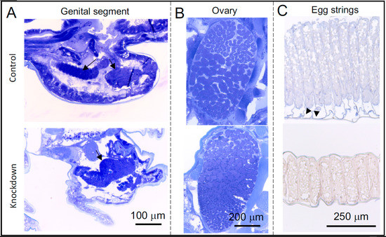 The silencing of LsCHS1 or LsCHS2 in females (trials 3 and 4) induced changes in the ovaries, oocytes, and eggs. Females treated with dsLsCHS1 had a malformed genital segment (Figure 6). Histological examination revealed that the LsCHS1 knockdown females with phenotype 1 had oocytes of normal appearance, while abnormalities were apparent in the oocytes and the ovaries of lice with phenotypes 2 and 3 (Figure 9A,B). The oocyte organization in adult LsCHS1 knockdown deviated from the control, and the follicle inside the ovaries appeared irregular and smaller. All the dsLsCHS1-injected lice fell off the fish before they reached the mature adult stage, and hence reproduction could not be monitored.