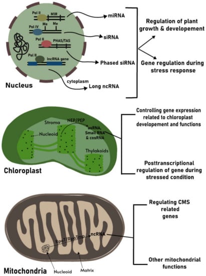 Technology improvements in the high-throughput sequencing of DNA and RNA and subsequent numbers of studies have provided extensive information on ncRNAs and their complex regulation networks in biological systems. In plants, more than 80–90% of transcripts are non-protein-coding RNAs [,], where a high number of these have been reported as potential regulatory molecules for various biological processes. With the availability of large data on plant ncRNAs, functional characterization reports revealed their pivotal potentials in controlling gene expression. However, investigations on plant organelles such as chloroplasts or mitochondrial genome-encoded ncRNAs are still sparse.