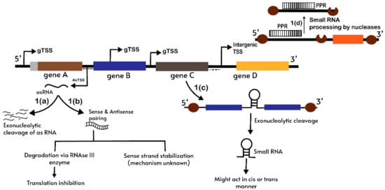 High activity of NEP in the plastid during germination was suggested to cause complete transcription that leads to an elevated amount of antisense RNAs production in Arabidopsis. It was postulated that these antisense RNAs might be crucial for suppressing NEP-generated mRNAs during subsequent developmental stages where PEP activity becomes significant []. Interestingly, in barley, numerous TSSs were observed to be present within operons, intergenic and annotated complementary strand genes that were speculated to cause transcriptional uncoupling, leading to ncRNA generation []. The accumulation or production of these ncRNAs could be dependent either on chloroplast maturation or on plant developmental stages. Similarly, in Chlamydomonas chloroplasts, though few genes are cotranscribed, each individual gene also has its own promoter which might give rise to a cosRNAs TSS [], as noticed in plant mitochondria []. Recently, a mitochondrial ncRNA, “FSNR”, which was considered to be associated with CMS in Silene vulgaris, was speculated to have its own promoter as it was not overlapping with any other transcribed region []. Thus, ncRNAs with a TSS could be transcribed by RNA polymerase, where RNA polymerase interaction with the promoter might depend on cooperative actions of other effectors that might be depending on physiological conditions or homeostasis of the organelle.