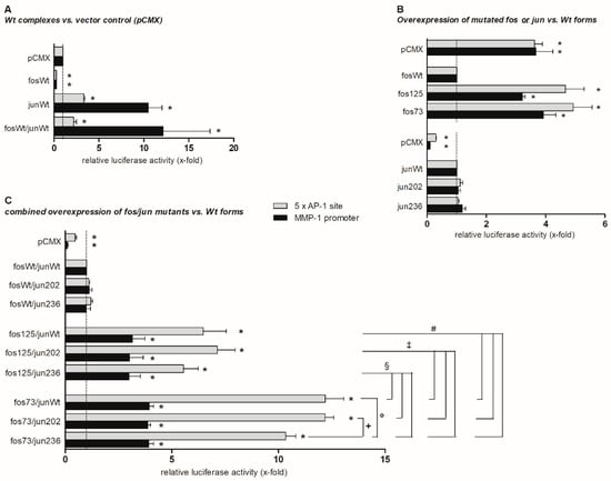 Effects of cjun and cfos mutations on reporter gene expression. The graph shows pentameric AP-1 site- and matrix metalloproteinase 1 (MMP-1) promoter-dependent expression of firefly luciferase 2 days following transfection of NIH-3T3 cells with wt (A) or mutated (B,C) cfos and cjun expression plasmids (determined in biological triplicates; means ± standard error of the mean). Firefly luciferase expression levels were normalized to renilla luciferase expression levels in the respective samples (transfection and normalization control). Results are presented as relative luciferase activity (in x-fold) related to the expression level in the presence of the control vector (A), cfos wt expression vector (B), or cfos and cjun wt vectors (C). For normalization and to correct for different transfection efficiencies, the renilla luciferase-expressing vector pRL-CMV was co-transfected. In all analyzed samples, luciferase expression was easy to detect and clearly exceeded background levels in non-transfected cells. * p ≤ 0.05 vs. controls, i.e., pCMX (A), fosWt (B), and fosWt/junWt (C); +, °, §, ‡, and # p ≤ 0.05 vs. respective other mutants; fos73 represents the double mutant fos73/fos125.