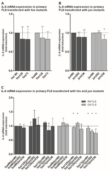 In the case of Il-6, comparable results were observed. Transfected mutants showed either no effect (jun202 in OA FLS; Figure 4B) or a numerical (and in the case of jun236 even significant) reduction (Figure 4A,B). Expressed together, only fos125/jun202-containing OA FLS induced a significant increase in IL-6 expression, whereas the fos125/junWt-expressing approach and all fos73/125-containing combinations in OA FLS showed significantly downregulated Il-6 mRNA levels (Figure 4C). Though less prominent (presumably due to the higher standard deviations), the mutants predominantly had very similar effects in RA FLS.