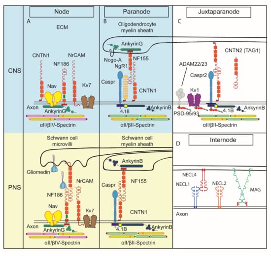Molecular structure of the perinodal areas. Schematic representation of the four specialized domains encountered along a myelinated axon. (A) Nodes, (B) paranodes, (C) juxtaparanodes and (D) internodes. Nodes and paranodes differ in molecular composition between the central nervous system (CNS) and the peripheral nervous system (PNS). In the blue background are depicted the CNS, while in yellow, the PNS node and paranode. The most notable difference between the two systems is the presence of Schwann microvilli in the PNS node, while the CNS node is mostly surrounded by extracellular matrix (ECM) components and astrocyte processes (not shown). Nodes contain clustered Nav channels while Kv channels are accumulated in the juxtaparanodes (JXPs). Each domain is enriched with cell adhesion molecules (CAMs) and other proteins that are important for the clustering of the channels (details in text), while the paranodal junction complex separates the two clusters from each other. Contactins are present in these complexes, with Contactin-1 (CNTN1) being specifically enriched in the paranode and the CNS node, while Contactin-2 (CNTN2) contributes to the JXP complex. Further away in the internode, axo-glial contacts and signaling are mediated by nectin-like proteins and myelin-associated glycoprotein (MAG). Cytoskeletal elements like ankyrins and spectrins differ between the nodes and the rest of the areas.