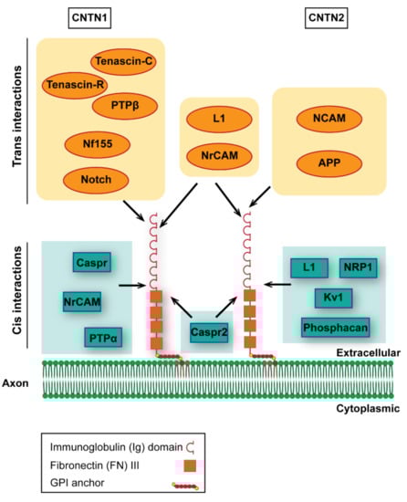 Contactins comprise a subfamily of the immunoglobulin superfamily of adhesion molecules. They are characterized by a glycosylphosphatidylinositol (GPI) anchor; therefore, they are released from the plasma membrane. All members have at least one isoform comprising of six Ig-C2 domains and four fibronectin 3 (FNIII)-like domains. They share a 45–65% protein sequence identity [,]. In mice, there are 6 Contactins, expressed mainly in the nervous system displaying a distinct and partially overlapping pattern ([] and reviewed in [,,]). Of these, CNTN1 and 2 are the ones implicated in myelinated axon organization, so we will mainly focus on these two members (Figure 2). All Contactins studied have been shown to be involved in shaping nervous system development, and some have been correlated with known human neurological disorders as addressed in Section 4. As detailed in this section, CNTN1 antibodies have been implicated in peripheral demyelinating neuropathies, while CNTN2 antibodies have been detected in a small subset of multiple sclerosos (MS) patients.