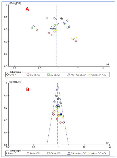 Funnel plot of the association between ABCA4 polymorphisms and risk of NSCL/P using the five genetic models: (A) rs560426 and (B) rs481931.