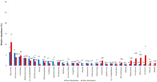 Analysis of variance (ANOVA) was performed using PAST v.3.25 [30] to assess differences among the relative abundances of the identified bacterial taxa, either prior to (marked as lowercase letters) or after chlorination (marked as uppercase letters). Student’s t-test was carried out to identify statistically significant differences for the calculated diversity indices prior to and after chlorination, at a probability p lower than 0.01 (**) or 0.05 (*).
