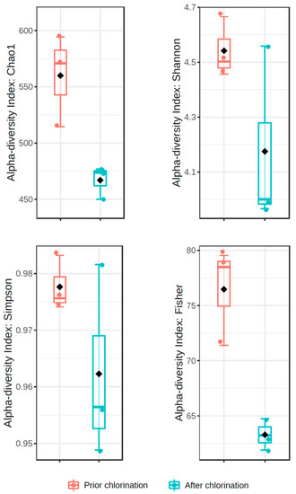 All amplicons obtained were subjected to demultiplexing and trimming, and Ν(s)-containing sequences, or reads with inappropriate length size or low-quality, were discarded [27]. Assembled sequences were improved in quality and chimeras were excluded through the use of USEARCH v.11 [28]. The clustering of non-chimeric reads into operational taxonomic units (OTUs) (number of reads ≥ 2) was conducted by using the -cluster_otus option. Genus-level taxonomic assignments were made using RDP (Ribosomal Database Project). The MicrobiomeAnalyst platform was employed to calculate the diversity indices of the microbial communities of wastewater prior to and after chlorination [29]. Chao1, Fisher, Shannon and Simpson indices were assessed to uncover alpha-diversity. In order to access beta-diversity, principal coordinates analysis (PCoA) was conducted in the MicrobiomeAnalyst platform by using the Bray–Curtis algorithm, followed by permutational multivariate analysis of variance (PERMANOVA).