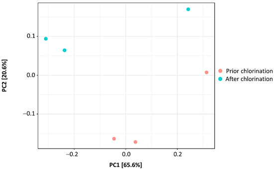 Bacterial richness was significantly decreased by chlorination (p < 0.05), resulting in the decrease in Chao1 index from 560 ± 24 to 467 ± 8 after disinfection (Figure 2). The Shannon diversity index was not statistically different in non-chlorinated and chlorinated effluent (4.54 ± 0.06 vs. 4.18 ± 0.19, respectively) (Figure 2). In addition, Simpson diversity did not significantly differ in the effluents prior to and after chlorination (0.98 ± 0.01 vs. 0.96 ± 0.01, respectively) (Figure 2), reaching values close to 1. On the other hand, Fisher’s diversity index lowered significantly from 76.47 ± 2.56 prior to chlorination to 63.27 ± 0.83 after chlorination (p < 0.01) (Figure 2). Pielou’s evenness indexes non-significantly differed in the effluent prior to and after chlorination (0.71 ± 0.02 and 0.67 ± 0.03, respectively). PCoA showed that the beta diversity of the bacterial communities did not statistically differ in the effluent prior to and after chlorination (F-value: 1.6101; R2: 0.287; p < 0.30) (Figure 3).