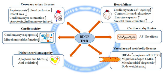 Because BDNF is a widely existing neurotrophic factor in brain tissue and peripheral nerves, it can affect nerve development, survival, and postinjury repair. Previous studies mainly focused on its role in neurological diseases and found that BDNF had protective effects against cerebral ischemic injury. Currently, more and more studies suggest that the BDNF/TrkB axis plays an important role in cardiovascular function. Here, we summarize current advancements of the critical role of BDNF/TrkB in common CVD (Figure 1).