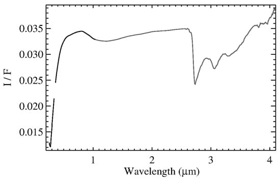 Merging the global average spectrum obtained in the VIS channel [] with the average IR spectrum derived here, we obtained a single global average spectrum of Ceres in the range of 0.25–5.0 µm. Then, we removed the thermal emission affecting the spectrum longward of 3.5 µm, as discussed in Section 2.2 (Figure 1).
