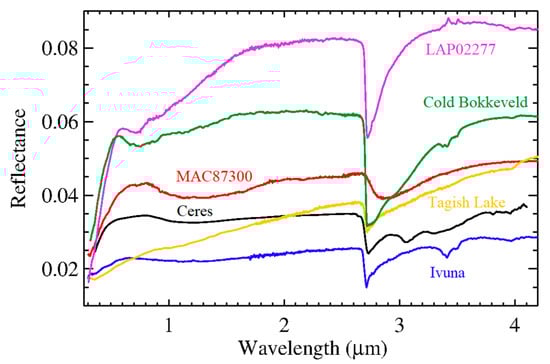 Marchi et al. [] and Kurokawa et al. [] found that a large fraction of the composition of Ceres should be composed of material similar to carbonaceous chondrites (CC), when taking into account both the IR global average spectrum and the elemental composition from the GRaND measurement. In particular, [] obtained best fits by adding the CC Ivuna (CI type) or LAP (CM type) to the modeled mixtures; [] obtained best fits using Ivuna (CI type), Tagish Lake (CM type), or Cold Bokkeveld (CM type). However, our analysis revealed that the above-mentioned CC cannot match both the VIS and IR regions of the average spectrum of Ceres. Instead, we considered MAC 87300 (CM type), which is already mentioned in [], whose spectral shape is most similar to the Ceres’ spectrum across the two spectral regions (Figure 2).