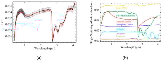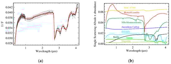 Panel (a): measured (black) and modeled (red) average spectrum of Ceres in terms of I/F (r × π). Error bars indicate uncertainties on absolute calibration. The best fit including all endmembers is discussed in De Sanctis et al. [] with the addition of heated-lizardite (see Table 1), and MAC 87,300 (see Figure 2). In panel (b), the single scattering albedo (SSA) of each endmember scaled for their respective relative abundance: MAC 87300 (orange), NH4-montmorillonite (dark green), heated lizardite (red), amorphous carbon (blue), dolomite (cyan), antigorite (purple), magnetite (pickle green).