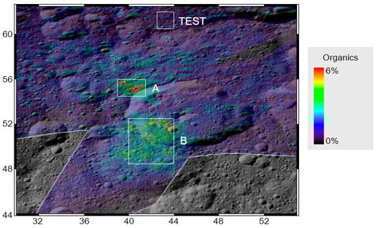 Map of organics’ abundance reported from Raponi et al. [], projected over a Framing Camera mosaic. The organic-rich areas A and B, and the test area have been marked. Coordinates of the areas are shown in Table 3.