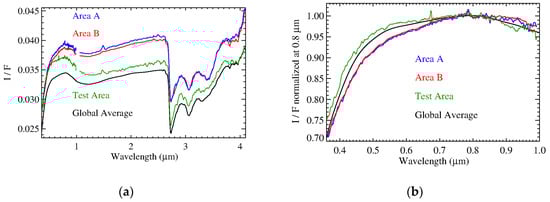 Close to the Ernutet crater (53.4 km diameter, at latitude ~53° N, longitude 45.5° E), a region of ~1000 km2 exhibits a prominent and complex 3.4-µm band, composed of several bands: near 3.38–3.39 µm, 3.40–3.42 µm, and 3.49–3.50 µm. These spectral features are characteristic of the symmetric and antisymmetric stretching frequencies of methyl (CH3) and methylene (CH2). The main candidates for these bands are organic materials containing aliphatic hydrocarbons [,], probably with some aromatic hydrocarbons and heteroatoms []. Mapping the band depth at 3.4 µm [,], the organic material is found mainly in two broad areas: one close to the northwestern portion of the crater, and one located on the southwestern part. Here, we produced two average spectra considering rectangular portions of these two regions (A and B, respectively), delimited by the coordinates shown in Table 3 (Figure 4). Moreover, we accounted for a test area outside the organic-rich regions to rule out any possible instrumental effects that may affect the specific data we collected for the analysis of the organic-rich areas (Figure 4). We accounted for acquisitions in the VIS and IR channel performed simultaneously, which covered the whole area of interest (spacecraft event time: 487085891). For each area, the average spectra obtained from data from the VIS and IR channels were merged to obtain a single spectrum from 0.25 to 5.0 µm.